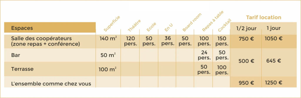 La salle des coopérateurs de 140 m² peut accueillir 120 participants en "théâtre" ou être aménagée en "U", en "boardroom", en "classe" pour des réunions dès 15 personnes.